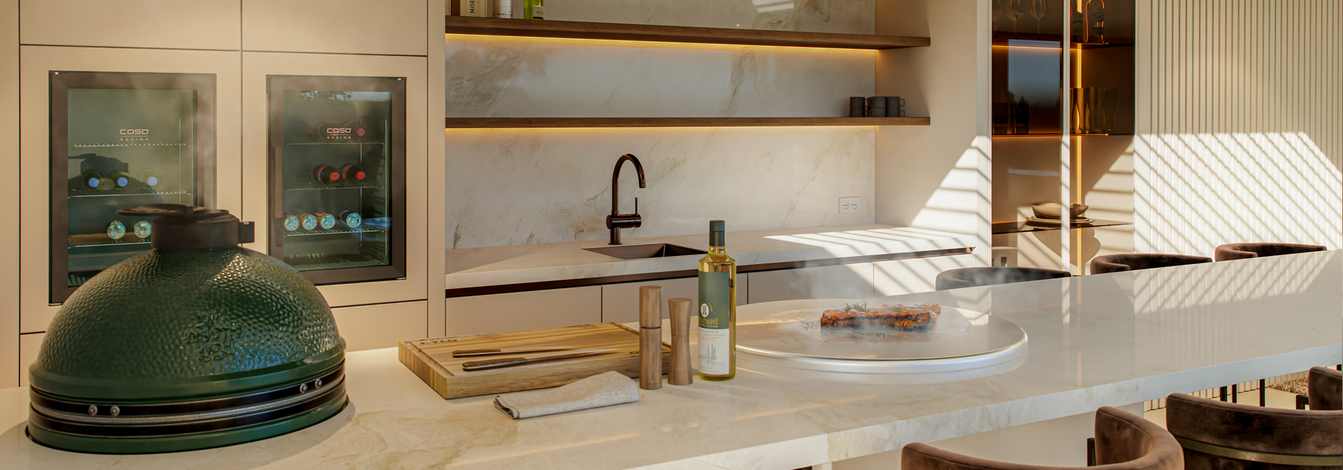 De basis bestaat uit hoogwaardig roestvrij staal, zorgvuldig afgewerkt met duurzame poedercoating in uiteenlopende kleuren en nuances. In combinatie met natuursteen en verfijnde frontafwerkingen ontstaat een rustig en elegant geheel. Pure voelt vanzelfsprekend. In vorm, in materiaal en in uitstraling. Het resultaat is een buitenkeuken die naadloos aansluit op het interieur van de woning en haar architectuur.